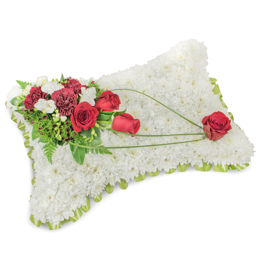 Convey your sympathies with our charming bouquet, combining white chrysanthemums, lush red roses, white freesias, deep red carnations, dianthus, and bear grass in a beautifully designed arrangement.