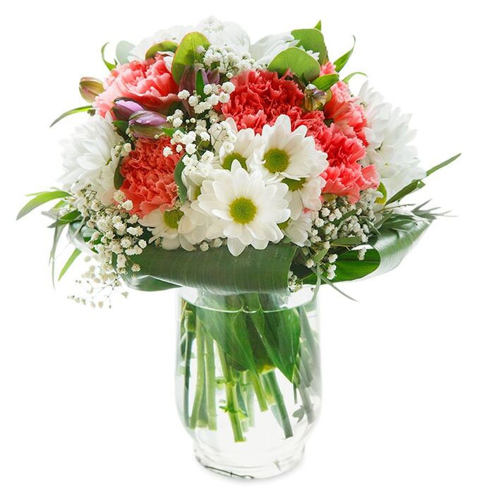 Illuminate any occasion with our radiant seasonal flower bouquet. This distinctive arrangement features snow-white chrysanthemums, fluffy gypsophila, and delicate light pink carnations, all beautifully arranged with aspidistra leaves.